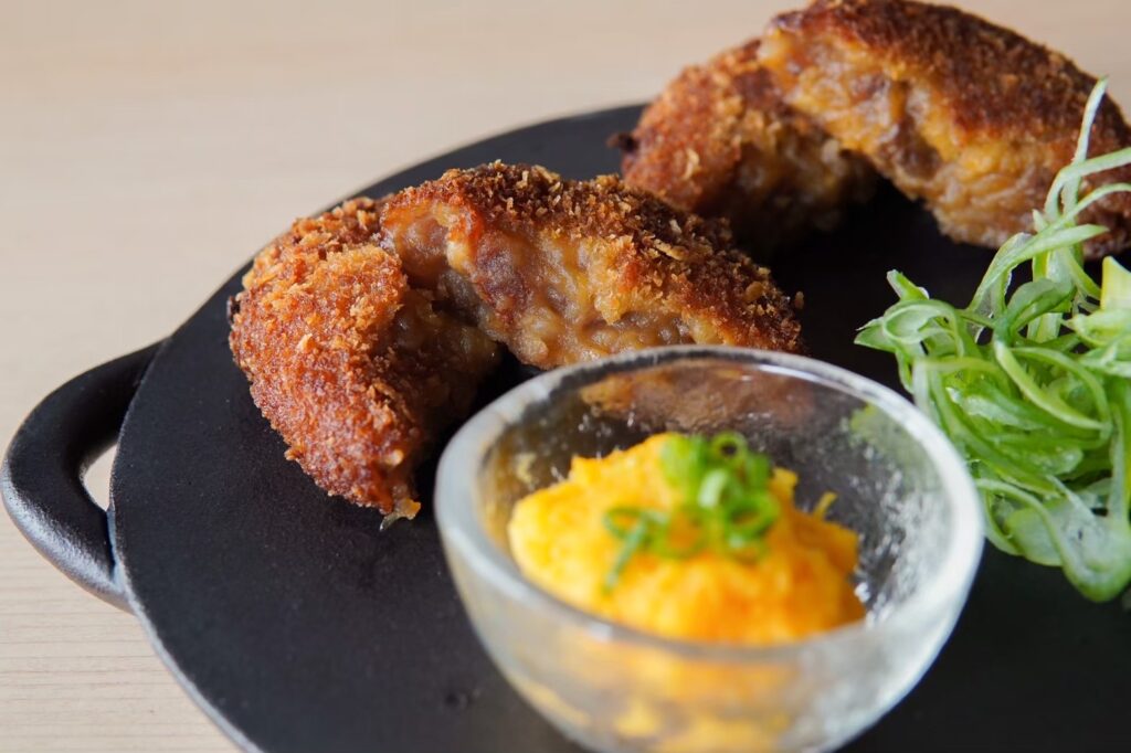 当店の人気メニュー! 黒毛和牛のリブロース、じゃがいも、玉ねぎを 具材に、煮詰めた砂糖醤油で甘辛く味付けしました 刻んだネギと黄身おろしを合わせれば お口の中はまさに”すき焼き” お酒が進む一品です サクサクな揚げたてをお召し上がりください |