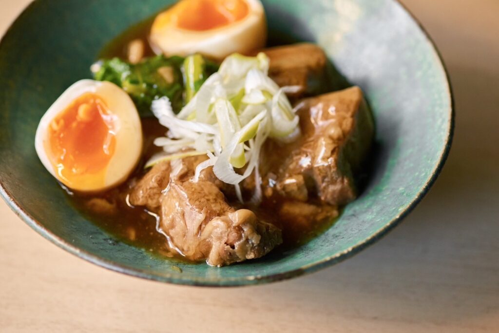 さっぱりとした脂が美味しい三元豚を お箸でほどけるほど柔らかく煮込みました 豚の旨みたっぷりの炊き汁はあんかけにして 角煮と玉子に和えています 味付けがしっかりしていますので ビールやハイボール、サワーなど スッキリ系のお酒とお召し上がりください |